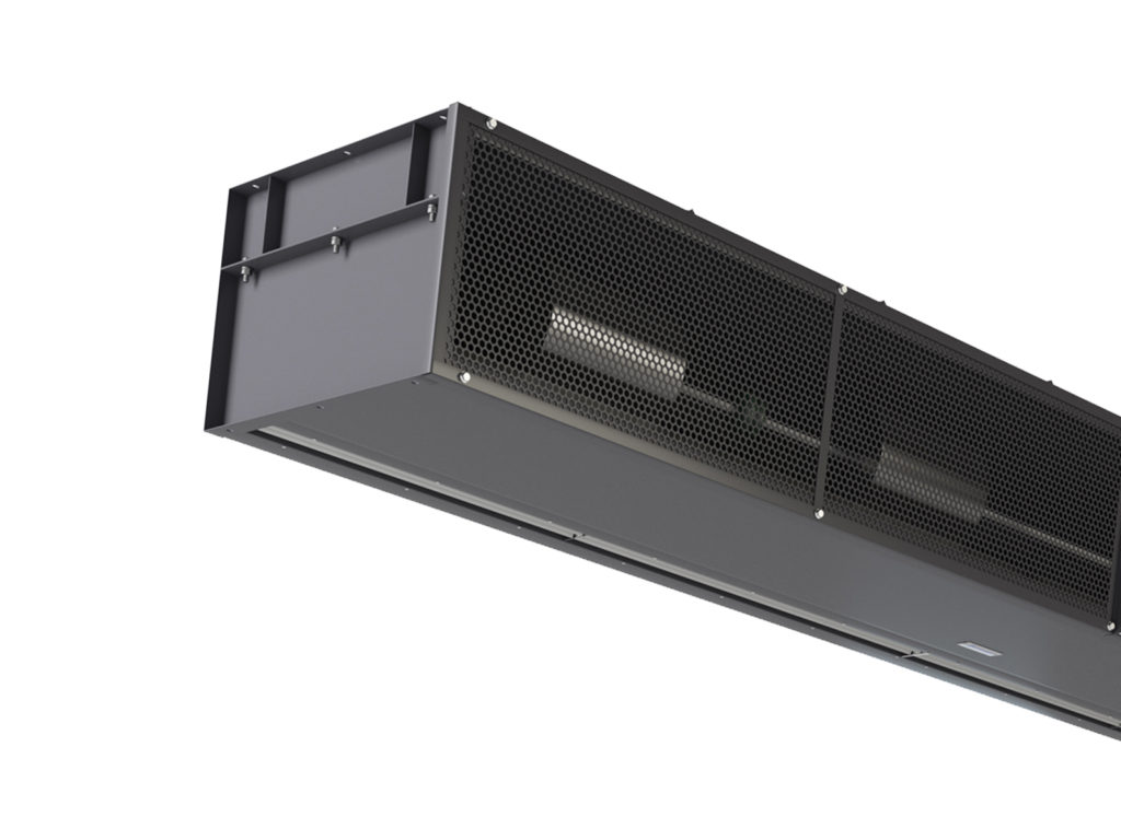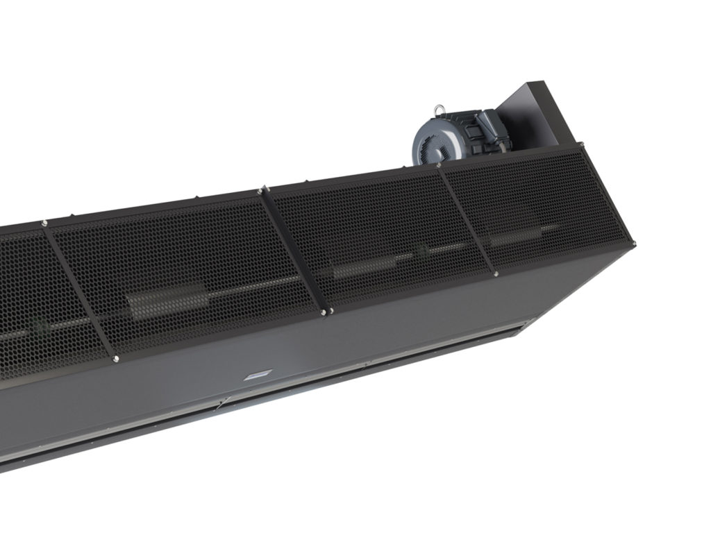 The Berner Industrial Belt Drive 20 Air Curtain has a durable, all welded construction with gray powder-coated aluminized steel exterior and removable lower section for simplified access to internal components.
